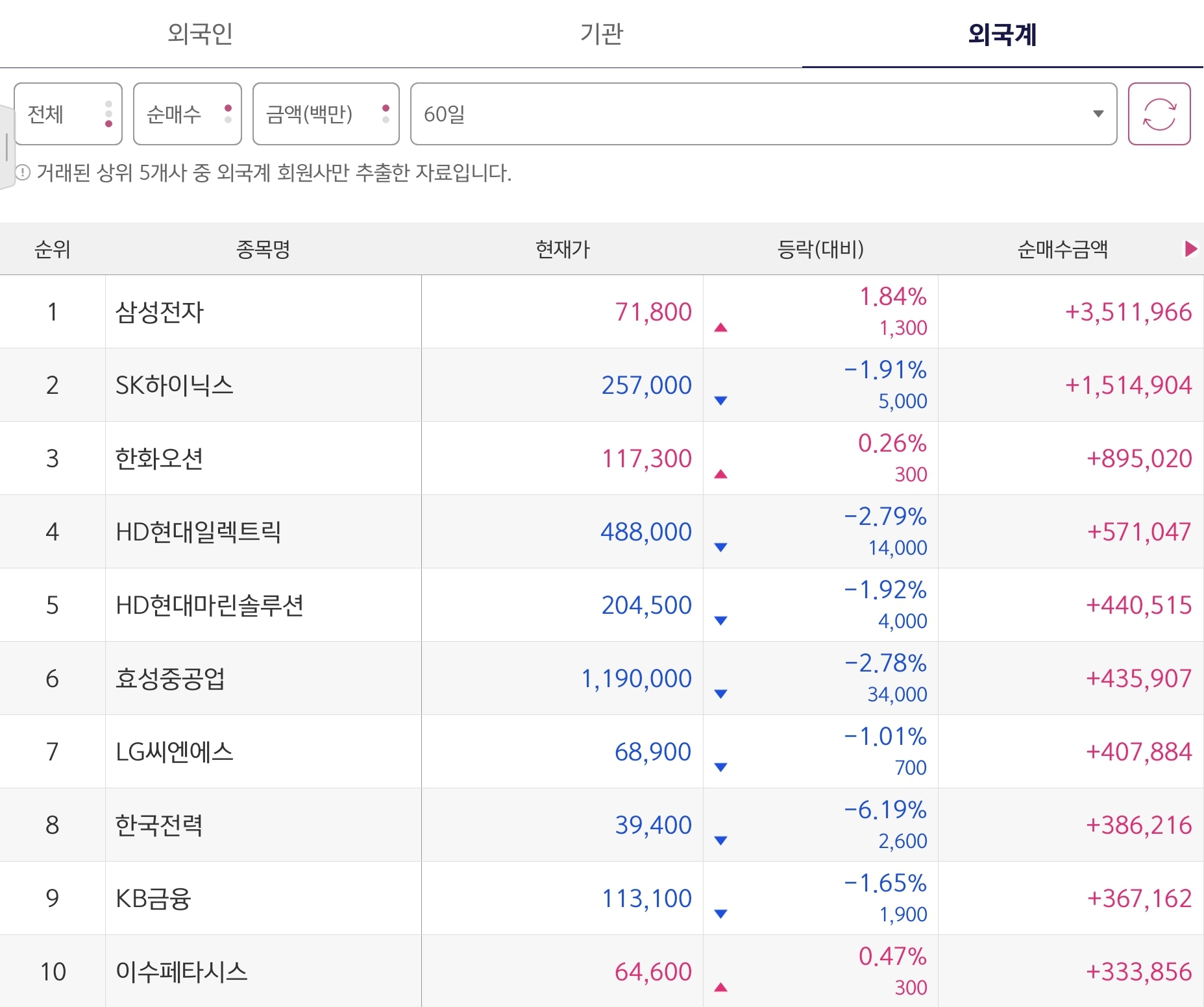 - 삼성전자: 순매수 금액이 3,423억 → 3,511억으로 증가하며 1위 유지. 주가도 상승.