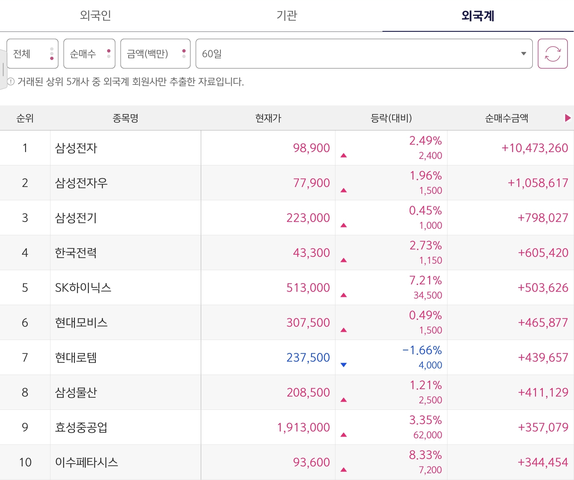 60일 누적 순매수 TOP10