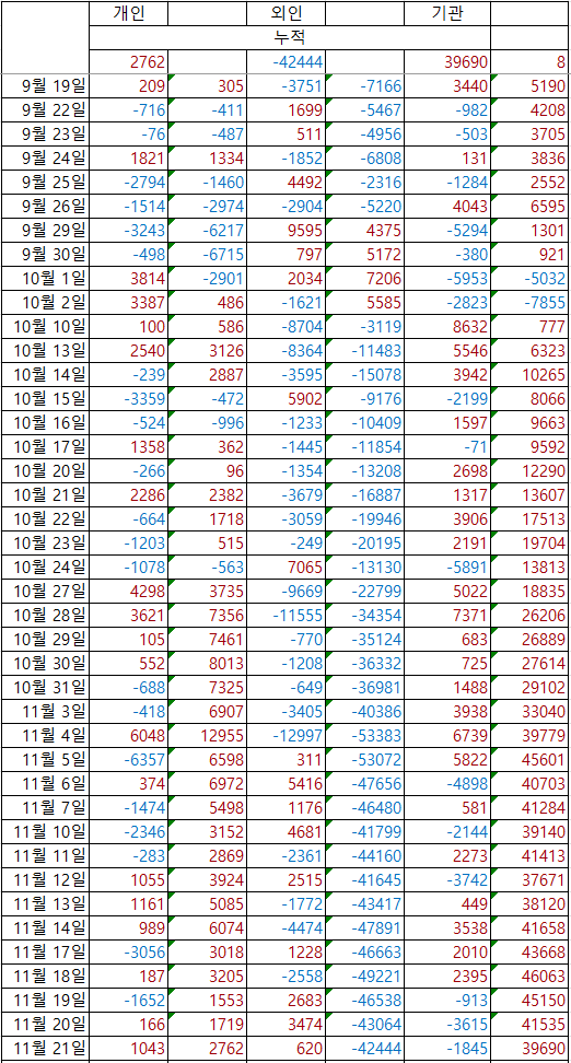 - 11월 수급 기준: 외인 강한 매도 우위, 기관 대규모 현물 매수