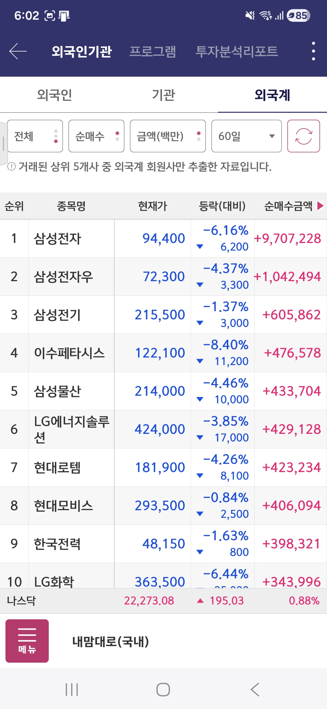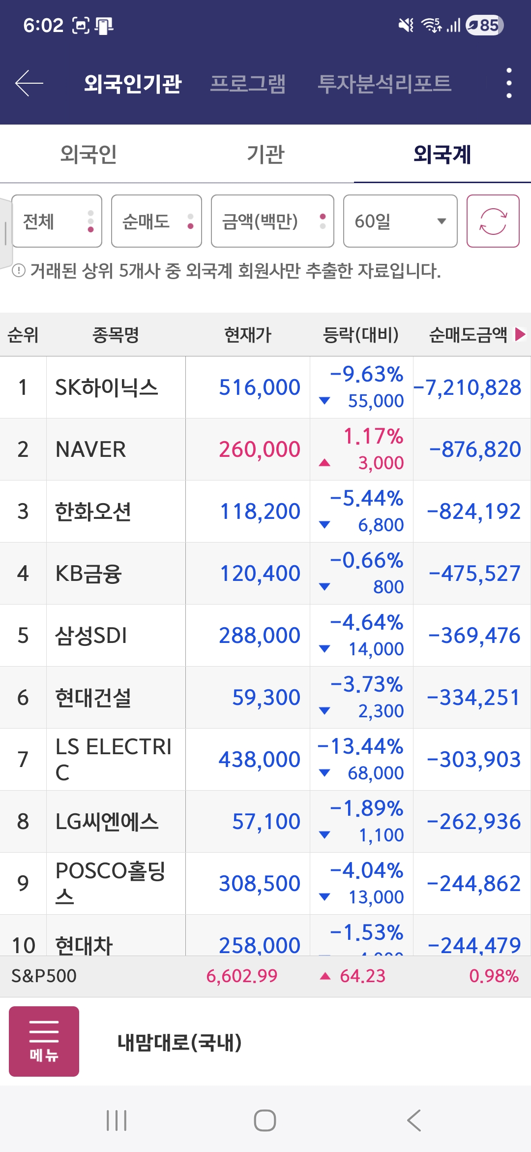 - 플랫폼/통신: NAVER 60일 매도, SK텔레콤 5일 매수.