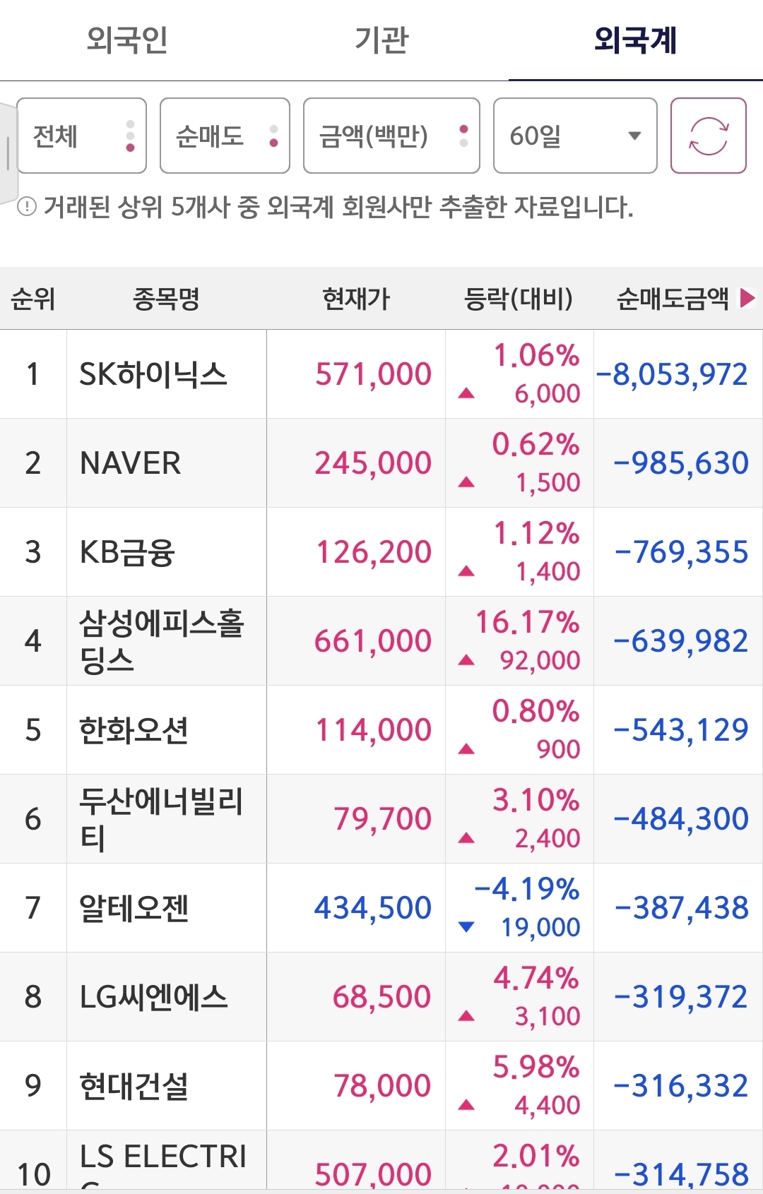 - 장기(60일) 매도인데 단기(5일) 매수: SK하이닉스