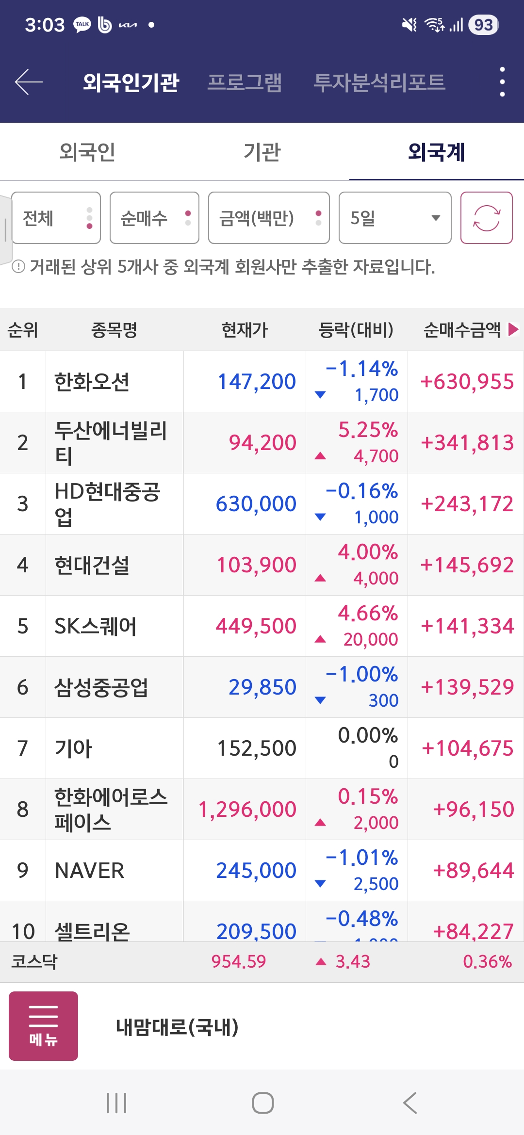 - 조선/해양 쏠림: 한화오션·HD현대중공업·삼성중공업(5일), HD현대마린솔·HD한국조선해양(60일)