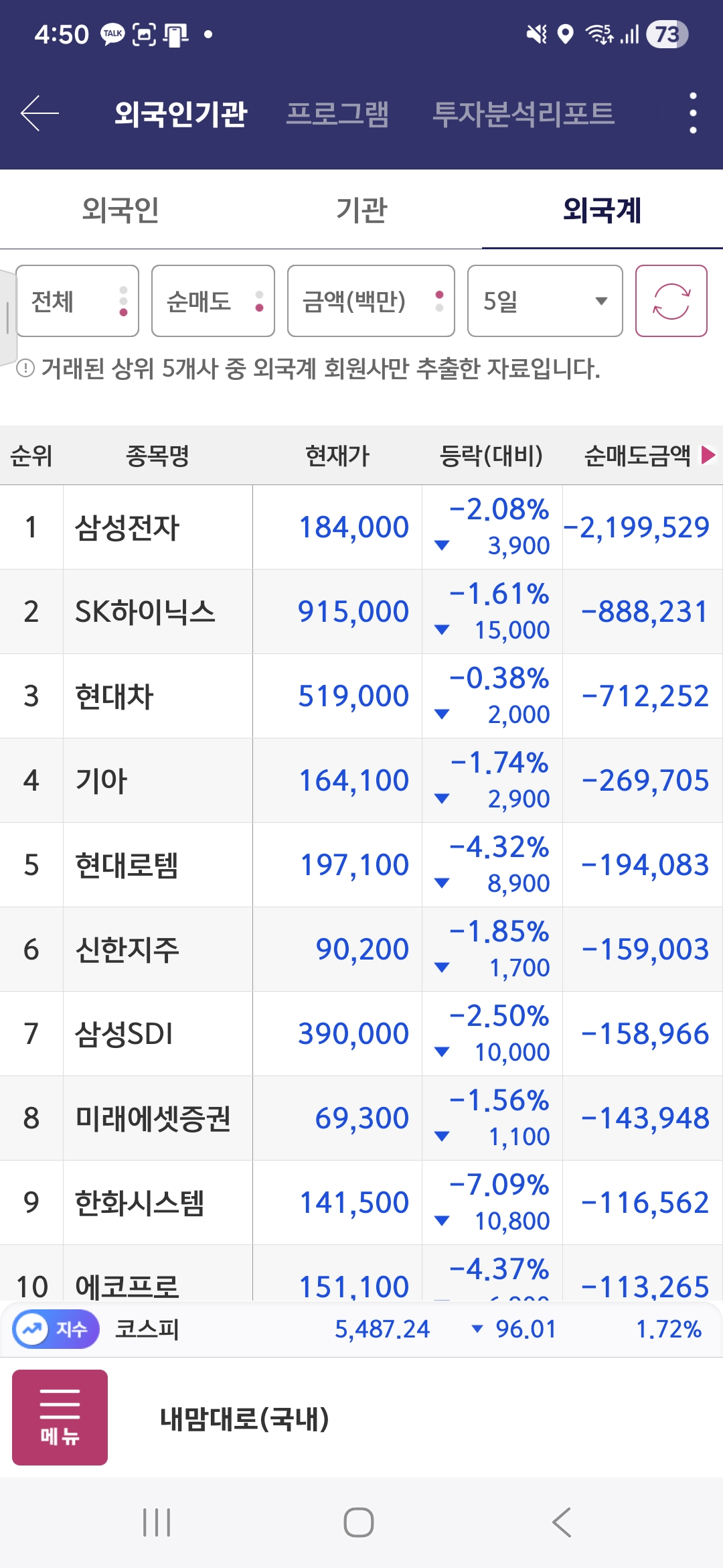 • 5일 순매도 ∩ 60일 순매도 = 4/10 (40%) - 삼성전자, SK하이닉스, 현대차, 기아