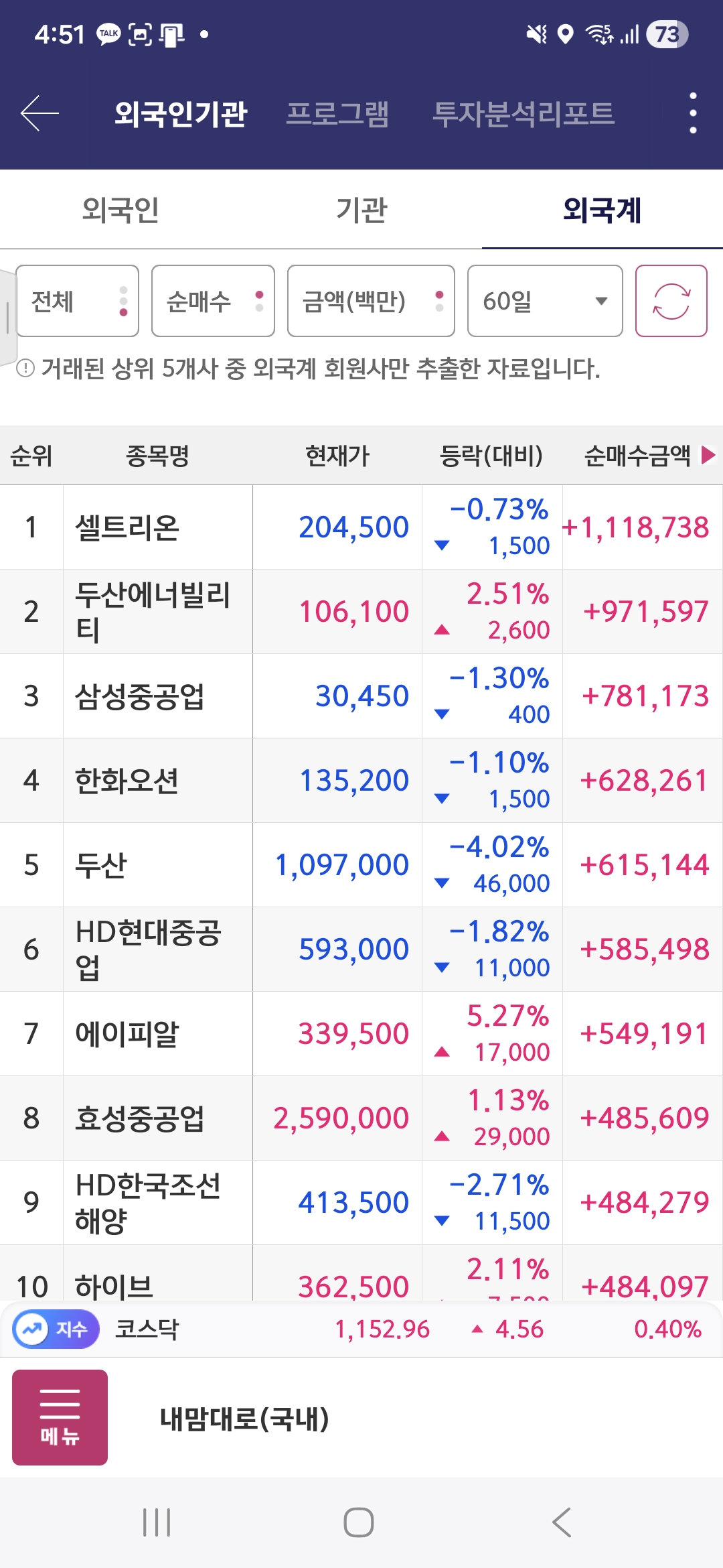 • 외국계는 반도체·자동차 비중을 계속 줄이는 반면, 조선·방산·중공업 쪽은 5일과 60일 모두 매수 우위가 이어지며 자금이 확실히 이동하는 모습입니다.