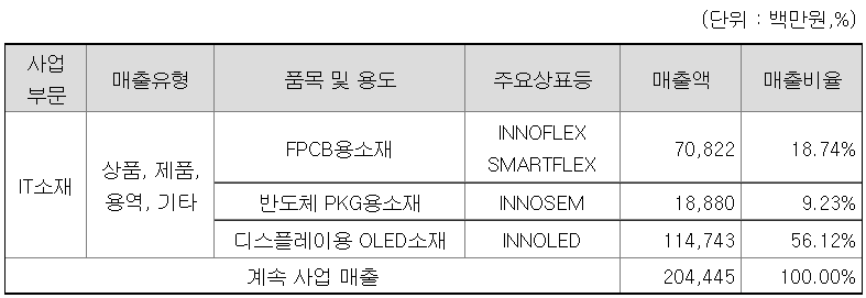 주 사업분야는 FPCB용 소재(18.74%), 반도체 PKG용 소재(9.23%), 디스플레이용 OLED 소재(56.12%)이며 2Q21 매출 현황은 아래와 같습니다. 나머지 분야는 정체 또는 약간의 성장세를 보이고 있으나 OLED 소재의 수출 증가(전년 도 대비 48.5% 증가)가 실적 개선을 드라이브하고 있습니다.